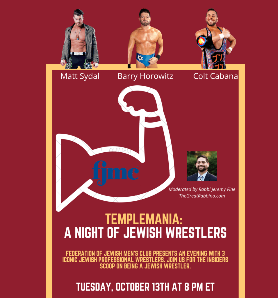New Event Announcement: FJMC Presents TempleMania – A Night of Jewish Wrestlers Posted by jfine1126 on September 8, 2020 The Federation of Jewish Men’s Club in collaboration with The Great Rabbino is putting on an event with 3 legendary Jewish wrestlers. Contact us for more! Share this: Click to share on X (Opens in new window) X Click to share on Facebook (Opens in new window) Facebook Like Loading... Related