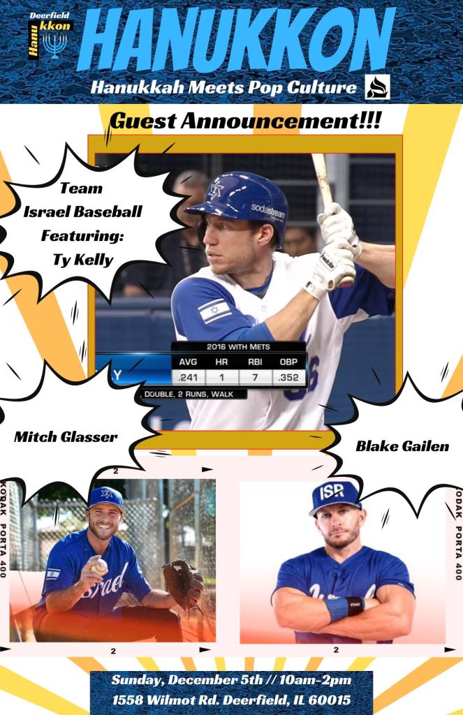 Stars of Team Israel Baseball Ty Kelly, Blake Gailen and Mitch Glasser will appear at Hanukkon in Deerfield. Hanukkon is a program of Congregation B’nai Tikvah where Rabbi Jeremy Fine serves as the rabbi. They will be giving a talk with superfan Kenny Stolman and hitting the blowup batting cage with the kids! The event runs from 10am-2pm. More information on the synagogue’s Facebook page.