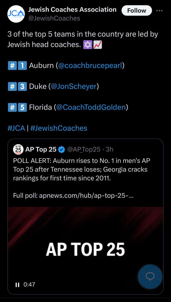 3 NCAA Teams Led By Jewish Coaches Posted by jfine1126 on January 15, 2025January 13, 2025 This unbelievable! 3 of the top 5 NCAA Basketball teams are led by Jewish coaches. Wow!!! Share this: Click to share on X (Opens in new window) X Click to share on Facebook (Opens in new window) Facebook Like Loading... Related