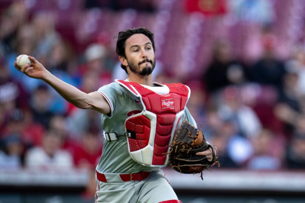 Philadelphia Phillies catcher Garrett Stubbs (21) throws to first base for an out in the first inning of the MLB baseball game between the Cincinnati Reds and the Philadelphia Phillies at Great American Ball Park in Cincinnati on Wednesday, April 24, 2024.